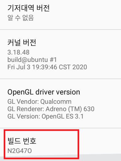 또 맨 밑으로 내리면 '빌드 번호'가 보일겁니다. 여러번 클릭해서 개발저 옵션의 권한을 얻어야합니다.