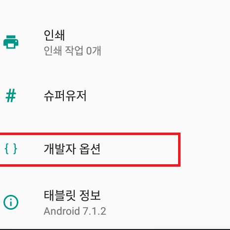 그 다음에 뒤로가기를 하면 아까는 없던 '개발자 옵션'이 생겼을겁니다. 클릭해서 들어가주세요.