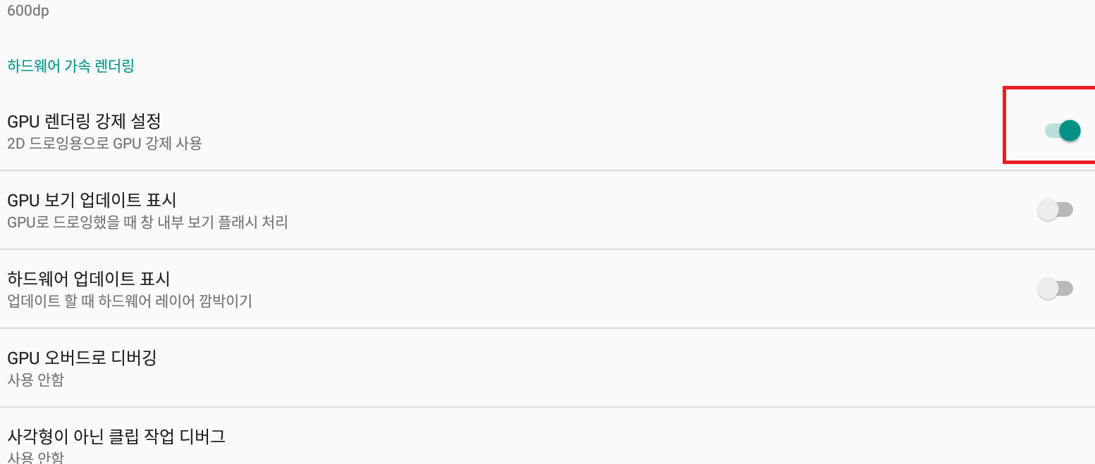 밑으로 내리다보면 'GPU 렌더링 강제 설정'이 보일겁니다. 사진처럼 활성화를 해주세요.
