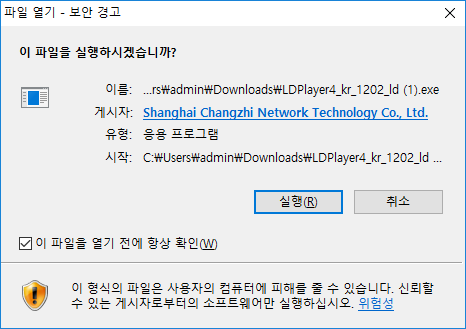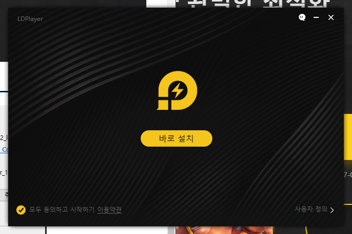 클릭하면 바로 ld플레이어 다운로드가 시작됩니다. 실행, 바로설치를 눌러주세요.