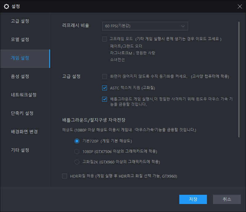 다음은 게임설정란입니다. 자신이 직접 플레이하고 고사양으로 즐기고 싶다하시면 고프레임모드를 키시면 됩니다.